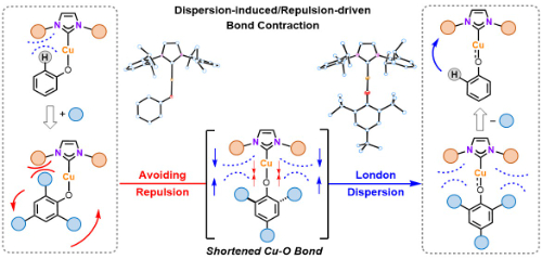 近日,清华大学程津培/杨金东团队与李隽/胡憾石教授合作在铜(I)酚氧配合物中发现了一种反直觉的成键模式:酚环上存在大位阻取代基使Cu–O键收缩,但却并未使Cu-O键的强度增加。结合晶体结构分析与理论计算研究,作者发现N-杂环卡宾配体与邻位叔丁基酚之间的伦敦色散力 (LD) 在该构象重组中起关键作用。局部能量分解 (LED)分析量化了显著的色散稳定化能 (高达11.2 kcal·mol⁻¹)。值得注意的是,自然轨道分析表明,尽管π相互作用增强... 2025-10-14