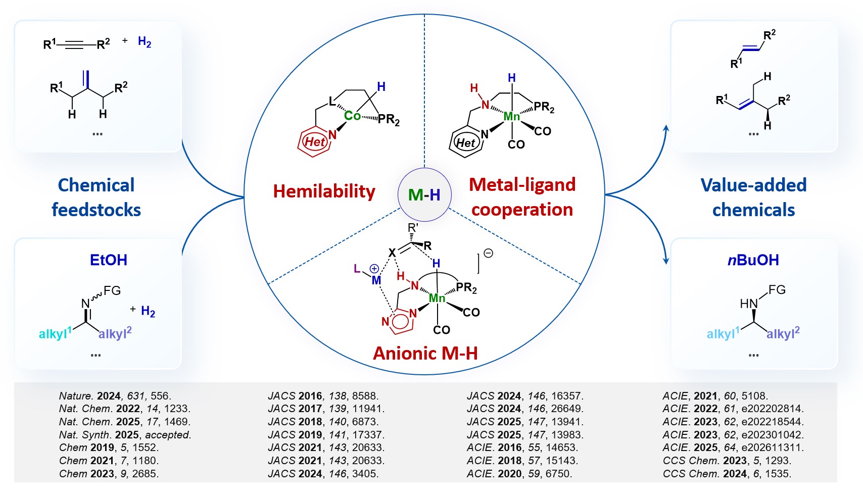 Catalytic hydride transfers mediated by metal hydrides represent a prominent transformation in synthetic chemistry. However, most of these processes rely heavily on precious metal-based catalysts. Our aim is to discover novel and efficient metal hydride catalytic systems based on earth-abundant metals through an in-depth understanding of the structure and reactivity relationships of metal hydrides. Towards this goal, we have developed effective strategies to control the reactivity and selectivity of such intermediates, including amino Mn-hydride, Mn/M’ bimetallic hydride and coordinately unsaturated Co-hydride, by modification of the peripheral activation groups on non-innocent ligands. Our work in this area has resulted in several key discoveries. First, we have uncovered a new bimetallic synergistic activation mechanism for hydride transfer process and a new mode of selectivity control by taking advantage of the hemilabile coordination of unsymmetrical ligands; Second, we have established efficient earth-abundant metal hydride catalytic systems, which enable over tens of thousands of TONs in ethanol upgrading and asymmetric hydrogenations; Finally, we have realized a series of new catalytic reactions including site-selective isomerization of gem-disubstituted alkenes and migratory hydrogenation of alkynes, which were not viable for precious metal based catalytic systems. With our continuous efforts, we hope it will pave an avenue for the development of ultra-efficient earth-abundant metal catalytic systems.